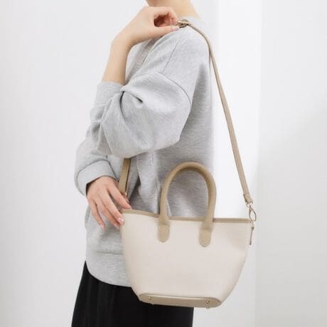 細かなシボ感のある合皮素材のハンドル部分と、ボディ部分の配色カラーがアクセントになる2WAYトートバッグ。