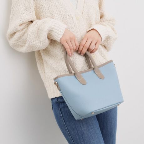 細かなシボ感のある合皮素材のハンドル部分と、ボディ部分の配色カラーがアクセントになる2WAYトートバッグ。