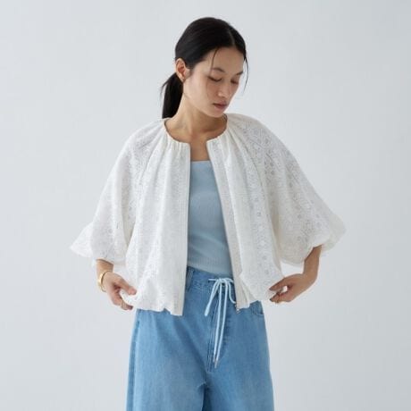 ・カジュアルなボトムスと合わせても、レースの表情で大人の女性に映えるスタイルに。