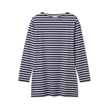 伝統的なバスクシャツから着想を得た、フレンチシックなボーダーチュニック。60年代を思わせるチュニック丈のAラインシルエットが軽やかに広がり、浅めのボートネックがデコルテを美しく見せてくれます。メンズ由来のデザインを女性らしく昇華し、研究による個性的なボーダーピッチと配色で、「LILY BROWN」唯一無二の1枚に仕上げました。左腕にはオリジナルロゴワッペンをあしらい、さりげないアクセントに。マイクロショートパンツを合わせてワンピース風に着たり、カプリパンツ×バレエシューズでパリジェンヌムードを楽しむのもおすすめです。