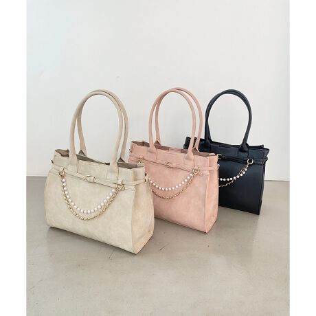 シーンに合わせてパールやチェーンを着脱できるため、デイリーからお仕事まで幅広く使える万能トートです。