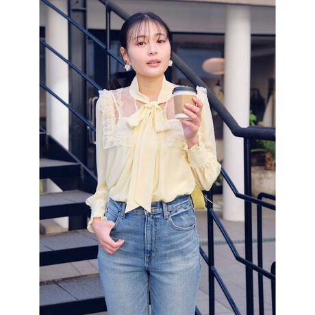 <b>【異素材フリルが奏でるヴィンテージムードのボウタイブラウス】</b>