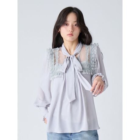 <b>【異素材フリルが奏でるヴィンテージムードのボウタイブラウス】</b>