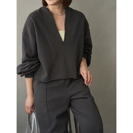 程よい薄さの裏毛を使用した、深めのVネックがポイントのリラクシーなスウェットプルオーバー。Vネックのシャープ感をキープしてくれるので、顔回りがすっきりした印象に。襟や裾はカットオフディティールにすることで程よい遊び心をプラスすることでアクセントになります。