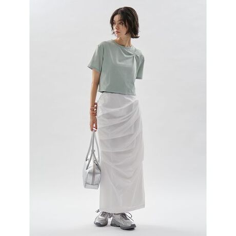サイドにはタック&ギャザーを施し、シンプルなシルエットに奥行きをプラス。