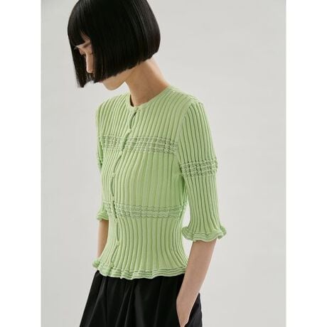 コンパクトなサイズ感ながらも伸縮性の高い編地のため、身体のラインを拾いすぎずすっきりと見せてくれます。