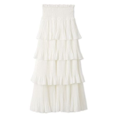 計算されたプリーツと動きのあるティアードが華やかなスカートです。