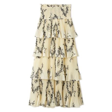 計算されたプリーツと動きのあるティアードが華やかなスカートです。