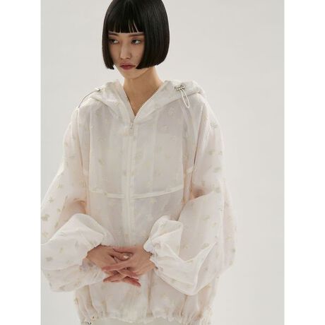 透け感のある華やかなジャガード素材に、emmiらしいフェミニンなエッセンスをプラスしたデザイン。ヒップが隠れる丈感で、アクティブな日常から旅先まで幅広く活躍します。