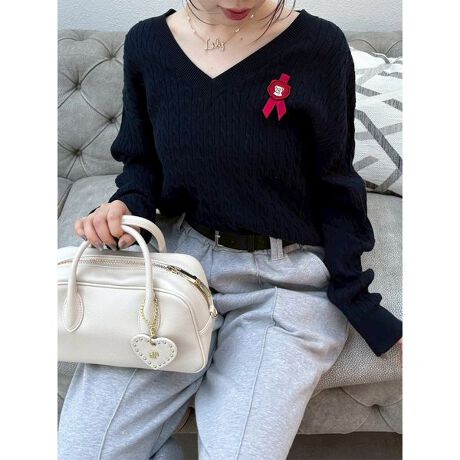 職人技が光るシーリングスタンプ風の立体刺繍をあしらい、1枚で存在感のあるデザインに仕上げたケーブルニット。細めのケーブル編みが知的で上品なムードを演出します。ゆったりとしたサイジングとジャストな丈感で、どんな体型の方にもバランスよくフィット。Vネックが首元に抜け感を与え、華奢なアクセサリーと相性抜群です。シャツをインしたレイヤードスタイルもおすすめで、着こなしの幅が広がる一着。
