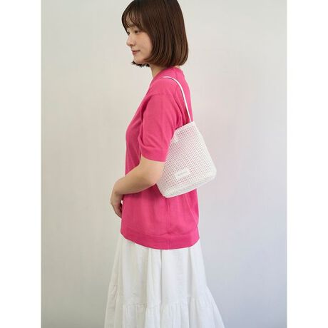 夏らしい雰囲気あふれるメッシュのミニトートバッグ。メッシュ部分は、網めの大きなメッシュとハリのある細かいメッシュを重ねて、シアー感がポイント。表にはemmiロゴのタグを縫いつけており、アクセントに。