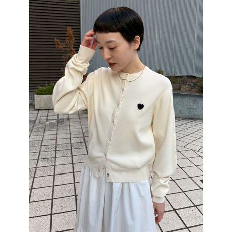 カーディガンは胸元のにちょこんと入ったサガラ刺繍のぷっくりハートがポイント。