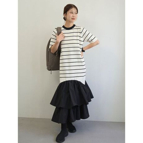 モードな雰囲気漂うニットトップスに、ふんわりとボリュームを持たせたスカートをドッキング。