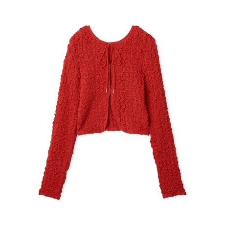 全体的にシャーリングを寄せた立体感のある見た目がポイントです。フロントにリボンがありフックでの仕様になるので前後2WAYでも着られて色々な着こなしが楽しめます。