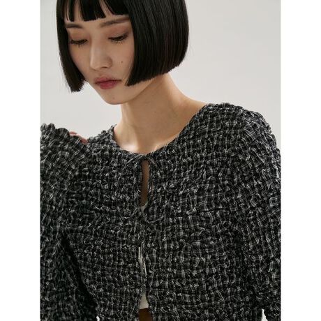 全体的にシャーリングを寄せた立体感のある見た目がポイントです。フロントにリボンがありフックでの仕様になるので前後2WAYでも着られて色々な着こなしが楽しめます。