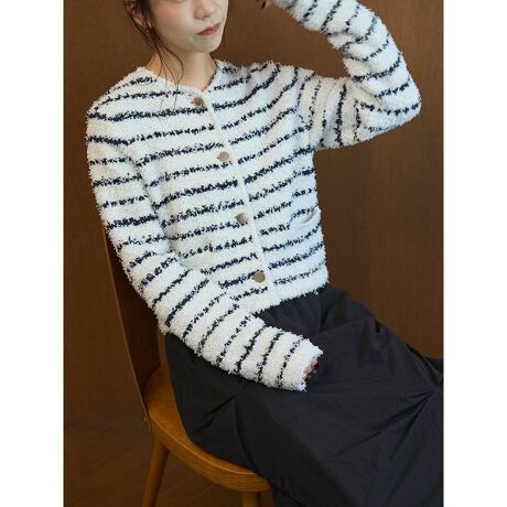 ツィードのような表情豊かなニット編地で仕立てた、上品なニットジャケット。フロントにあしらったゴールドボタンが、華やぎを添え、シンプルな装いに、さりげないアクセントをプラスします。