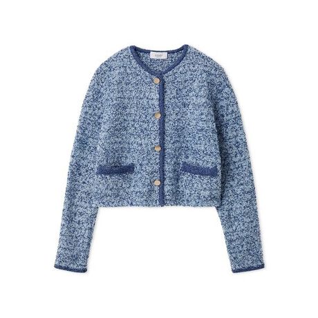 ツィードのような表情豊かなニット編地で仕立てた、上品なニットジャケット。フロントにあしらったゴールドボタンが、華やぎを添え、シンプルな装いに、さりげないアクセントをプラスします。