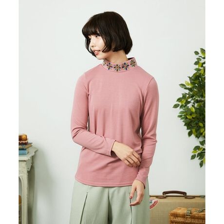 ホコモモラ定番のカットソーが春仕様で登場。レイヤードに最適なすっきりシルエットです。首元はゆとりを持たせた、密着しすぎず高すぎないハイネック仕立て。首元のお花モチーフは刺繍とパンチング、飾りボタンで表現したこだわりのデザインに。花弁部分のちらりと見える配色の別布が華やかな印象を後押しします。春らしいカラーリングで、色違いで揃えたいインナーです。