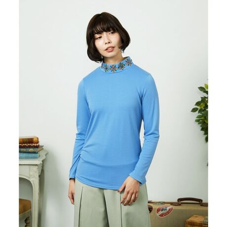 ホコモモラ定番のカットソーが春仕様で登場。レイヤードに最適なすっきりシルエットです。首元はゆとりを持たせた、密着しすぎず高すぎないハイネック仕立て。首元のお花モチーフは刺繍とパンチング、飾りボタンで表現したこだわりのデザインに。花弁部分のちらりと見える配色の別布が華やかな印象を後押しします。春らしいカラーリングで、色違いで揃えたいインナーです。