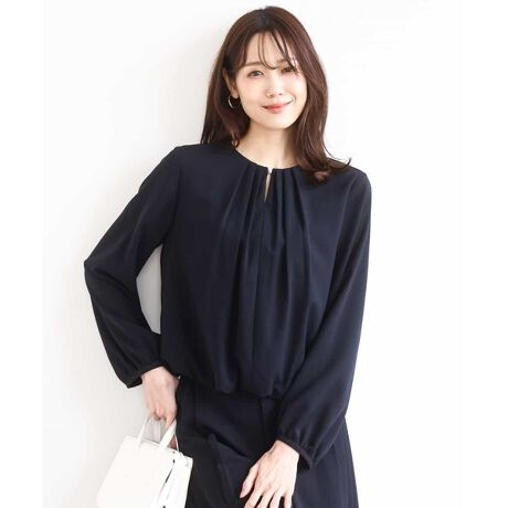 胸元のタックデザインとメタルパーツがお顔周りに華やかさをプラスしてくれるブラウス。身頃は裏地付きなので、透けの心配もありません。裾は裏地と一体になったバルーンシルエットでボトムにインしなくても自然と決まるのが嬉しいポイントです。