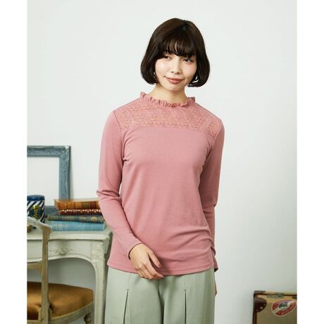 ホコモモラ定番のカットソーが春仕様で登場。レイヤードに最適なすっきりシルエットです。首元はヨークから上をレース素材に切り替えることで抜け感のあるデザインに。スタンドカラー仕立てで、ふっくらとした丸花モチーフのレースが上品で女性らしい印象を後押しします。春らしいカラーリングで、色違いで揃えたいインナーです。