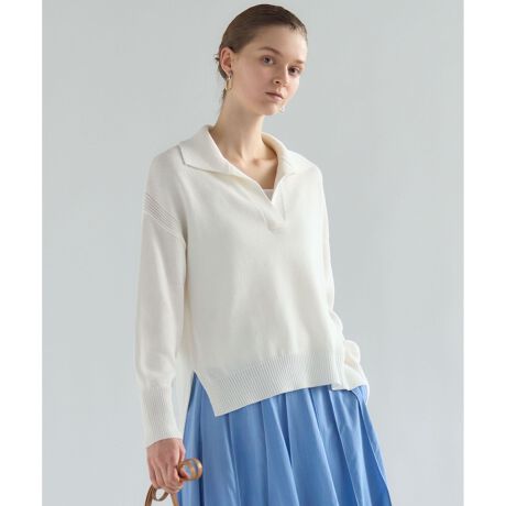 一枚で着映えが叶う、スキッパー襟のプルオーバーです。天竺で編み立てたシンプルなデザインながらも、計算されたサイズ感で、一枚着としてはもちろん、シャツやTシャツとのレイヤードスタイルもバランス良く決まります。脇にスリットが入っているため、前側の裾を軽くタックインし、襟を抜いて着こなすことで、簡単にニュアンスのあるこなれたスタイルが完成します。大人の女性にふさわしい、洗練された抜け感を演出してくれる一枚です。 カラーは、どんなスタイルにも馴染む清潔感あふれる定番カラーのホワイト(#001)、優しく柔らかな印象を与える上品なニュアンスカラーのベージュ(#033)、知的で洗練された雰囲気を醸し出す大人のためのシックなカラーのネイビー(#075)の3色展開です。