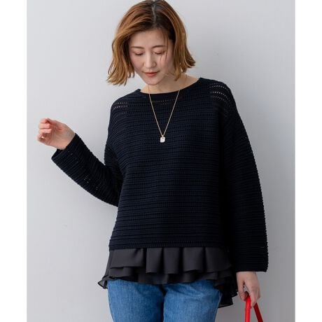 軽やかアイレットとツヤ感で魅せる、きれいめボートネックニット