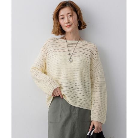 アイレットを効かせた軽やかな編み柄とナチュラルなツヤ感が魅力のボートネックニットです。程よいゆとりのある絶妙なサイズ感に仕上げているため、すっきりと着こなせ、大人のきれいめカジュアルスタイルを演出します。一枚でさらりと着るのはもちろん、シャツやカットソーとのレイヤードスタイルで、いつもの着こなしを一段とブラッシュアップしてくれます。カラーは、清潔感のあるホワイト(#001)、上品で肌なじみの良いベージュ(#033)、知的な印象のネイビー(#075)、顔周りを明るく見せるライトイエロー(#042)の4色展開です。