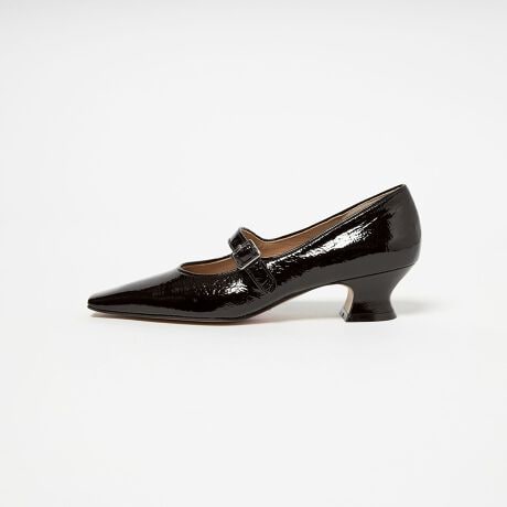 トレンド感のあるメリージェーンデザインをノーズ長めのスクエアトゥに組み合わせたパンプス。