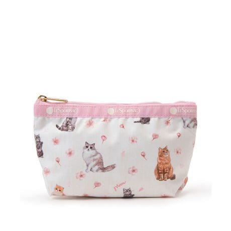 桜舞う中でポーズをとる親子の猫たちを描いた、やさしく可愛らしいプリントデザイン。アイボリーベースに淡いピンクの花びらと表情豊かな猫たちが、やわらかな季節の気分を運んでくれます。ピンクのロゴテープもポイント。