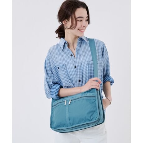 豊富なポケットデザインが人気のショルダーバッグです。荷物を入れていただく所が2つに分かれているので、貴重品と他の荷物を分けてお使いいただけるので大変便利です。折りたたみ傘や500mlのペットボトルも入り、B5サイズの手帳や本はスムーズに入ります。表側の底は、サイドのファスナーを開ければマチを広げることができます。付属のポーチが付いています。