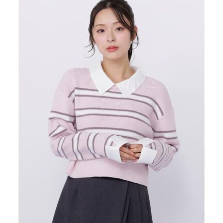 布帛のシャツ襟とカフスをドッキングした重ね着風ニットトップス。軽く膨らみのある糸を使い、ゆるっとしながら大きく見えないシルエットになっています。短丈シルエットで、チュールスカート、ミニボトム、パンツとも合わせやすく、コーディネートの幅が広がるアイテムです。※撮影時照明の関係により、色味が違って見える場合がございます。またパソコン・スマートフォンなどの環境により、若干製品と画像のカラーが異なる場合もございます。予めご了承ください。商品の色味は、商品単品画像をご参照下さい。※商品画像はサンプルのため、色味やサイズ等の仕様に変更がある場合がございますので、予めご了承ください。