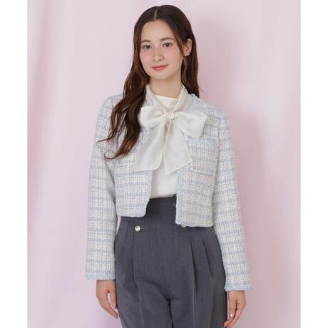 ツイード素材にビジューブレードを施した、華やかで高級感のあるノーカラージャケット。さっと羽織るだけでコーディネートを格上げし、特別感のあるスタイリングが完成します。コンパクトなシルエットは、スカートやワンピースとも相性バツグン。軽くて柔らかい着心地なので、デイリー使いはもちろん、フォーマルなシーンにも取り入れやすい上品アウターです。※撮影時照明の関係により、色味が違って見える場合がございます。またパソコン・スマートフォンなどの環境により、若干製品と画像のカラーが異なる場合もございます。予めご了承ください。商品の色味は、商品単品画像をご参照下さい。※商品画像はサンプルのため、色味やサイズ等の仕様に変更がある場合がございますので、予めご了承ください。