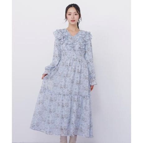 春らしい花柄が目を引くボリュームフリルワンピース。顔まわりを華やかに見せるフリルデザインが女性らしさを演出してくれます。手首をきゅっと締めるスリーブデザインもアクセント。ウエストはシャーリングゴム仕様、ほどよくフィットしながら快適な着心地です。一枚で着映えるデザインは、カーディガンやアウターを羽織るとロングシーズン活躍。季節感あふれるカラーを揃えています。※撮影時照明の関係により、色味が違って見える場合がございます。またパソコン・スマートフォンなどの環境により、若干製品と画像のカラーが異なる場合もございます。予めご了承ください。商品の色味は、商品単品画像をご参照下さい。※商品画像はサンプルのため、色味やサイズ等の仕様に変更がある場合がございますので、予めご了承ください。