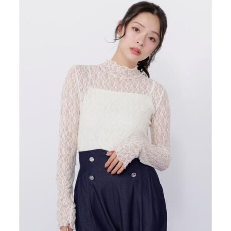 表面にポコポコとした凹凸があるストレッチレース素材を使用したシアートップス。襟ぐり・袖口・背中のメローフリルがポイントです。同色キャミソールの裏地つきで、パンツと合わせてヘルシーにも、スウェットやニットと重ねて首元や袖口から見せたり、キャミワンピースやジレのインナーとしてもおすすめです。一枚あるとコーディネートの幅が広がる便利なアイテムです。※撮影時照明の関係により、色味が違って見える場合がございます。またパソコン・スマートフォンなどの環境により、若干製品と画像のカラーが異なる場合もございます。予めご了承ください。商品の色味は、商品単品画像をご参照下さい。※商品画像はサンプルのため、色味やサイズ等の仕様に変更がある場合がございますので、予めご了承ください。