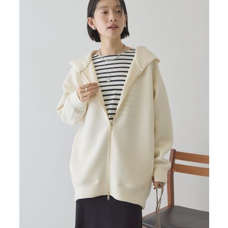 バックにタックを入れてややコクーン寄りの立体シルエットに仕上げたダブルジップパーカー。シームポケットにすることで、より洗練されたすっきりとした表情にアップデートしました。程よくハリのあるポンチ素材で肌触りがよく、軽さと透けにくいしっかりとした肉感を両立。アウター感覚で羽織れるゆったりシルエットがデイリーの着回しに便利な一着です。ダブルジップで着こなしに変化をつけられるのもポイントです。※モデル着用画像は、光の当たり具合で色味が違って見える場合がございます。※お使いのモニター環境によって商品の色味が違って見える場合がございます。