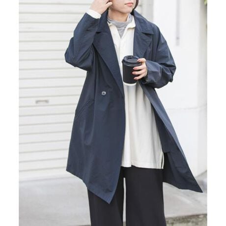 アーム周りや身幅は適度にゆとりをもたせて中のトップスは着こみやすい設定にし、ダブルボタンがアクセントに。