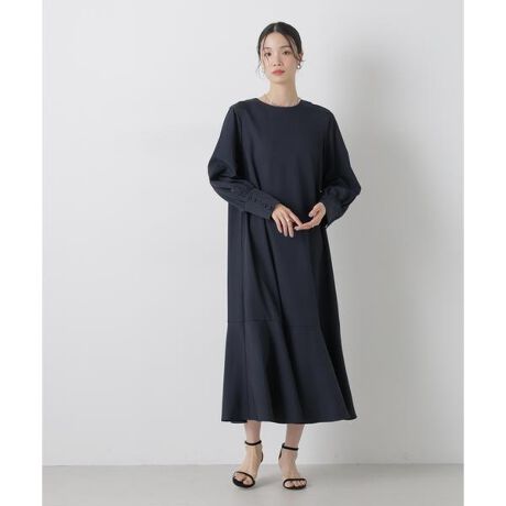 きちんと感とリラクシーな着心地を兼ね備えたロングワンピース。シンプルなデザインの中に、裾から切り替わるフレアデザインや、クルミ釦をあしらった長めの袖カフスなど、ディティールに個性が光る一品です。