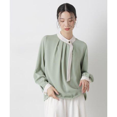 衿と袖のバイカラーとフロントに入ったタックが華やかなボータイブラウス。シンプルながらも上品さと女性らしい雰囲気を演出してくれるので、ON/OFFで様になる着映えアイテムです。