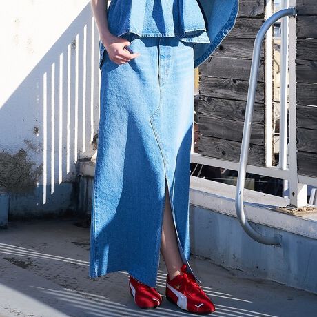 オリジナルのデニムロングスカートの登場。王道の空気感がありながらも旬のスタイリングにかかせないハイウエストデザイン。スタイルアップ効果が抜群にいいシルエットを追及し、腰まわりはきゅっとスッキリ。さらに足さばきなどライフスタイルシーンに寄り添った前後両面スリット仕様。ふくらはぎなどが露出しすぎないよう、バックスリットはスナップで開閉可能になっています。