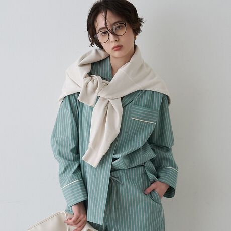 セットアップで統一感:同素材パンツと合わせてワンマイル〜オフィスカジュアルまで対応。
