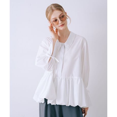 シンプルなシャツカラーに、ふんわりとしたペプラムシルエットを掛け合わせることで、甘さと上品さをバランスよくプラス。