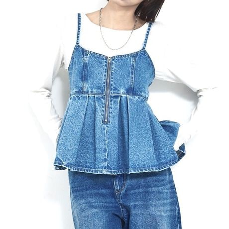 ウォッシュデニムのヴィンテージ感が高見えするビスチェライクキャミソール。ペプラムデザインが女性らしさを思いっきり演出しつつ、ウォッシュデニムの風合いが重厚感のあるデニムアイテムとして高見えを叶えます。レイヤードや単品使いなど長い季節、大人キュートなスタイリングに活躍します。ストラップは長さ調節可能。バストもバックリボンでサイズ調節可&フロントジップで着脱しやすくなっています。