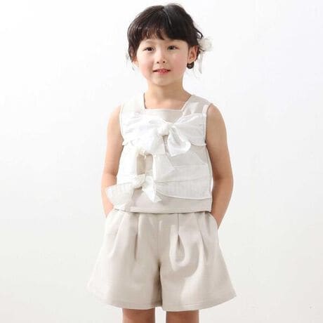 ボトムスは動きやすいキュロットタイプで、ふんわりとしたシルエットが女の子らしさを引き立てます。