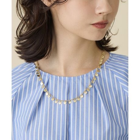 ■デザイン小さなラウンド型のメタルパーツを連ねた、ショートタイプのネックレスです。金具には、着脱しやすいマンテルを使用しています。パールバーネックレス(AS2VLS0002)との重ね付けもおすすめで、首元に程よい華やかさと立体感をプラスしてくれます。シンプルな装いの日でも、ひとつ合わせるだけで顔まわりを明るく見せてくれる、デイリーに活躍するアイテムです。