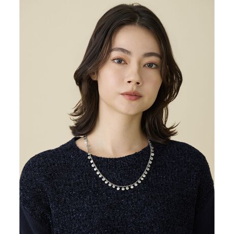 ■デザイン小さなラウンド型のメタルパーツを連ねた、ショートタイプのネックレスです。金具には、着脱しやすいマンテルを使用しています。パールバーネックレス(AS2VLS0002)との重ね付けもおすすめで、首元に程よい華やかさと立体感をプラスしてくれます。シンプルな装いの日でも、ひとつ合わせるだけで顔まわりを明るく見せてくれる、デイリーに活躍するアイテムです。