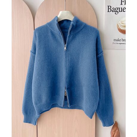 シンプルながらトレンド感のあるハイネックジップアップニット。