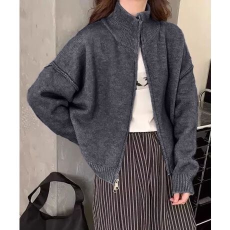 シンプルながらトレンド感のあるハイネックジップアップニット。