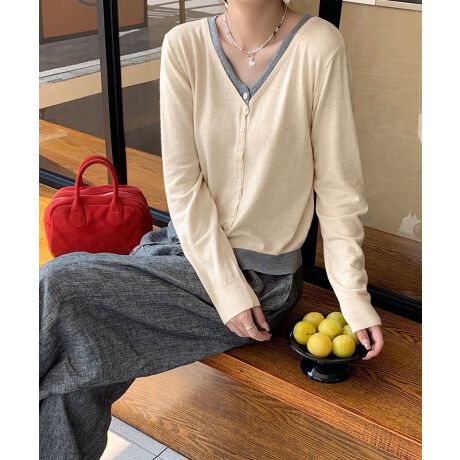 上品な配色ラインをあしらったレイヤードデザインのVネックニットカーディガン。