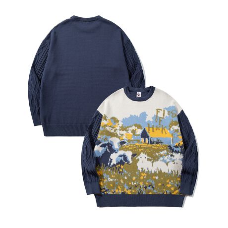のどかな牧場の風景を丁寧に編み込んだ、インパクト抜群の総柄ニット。